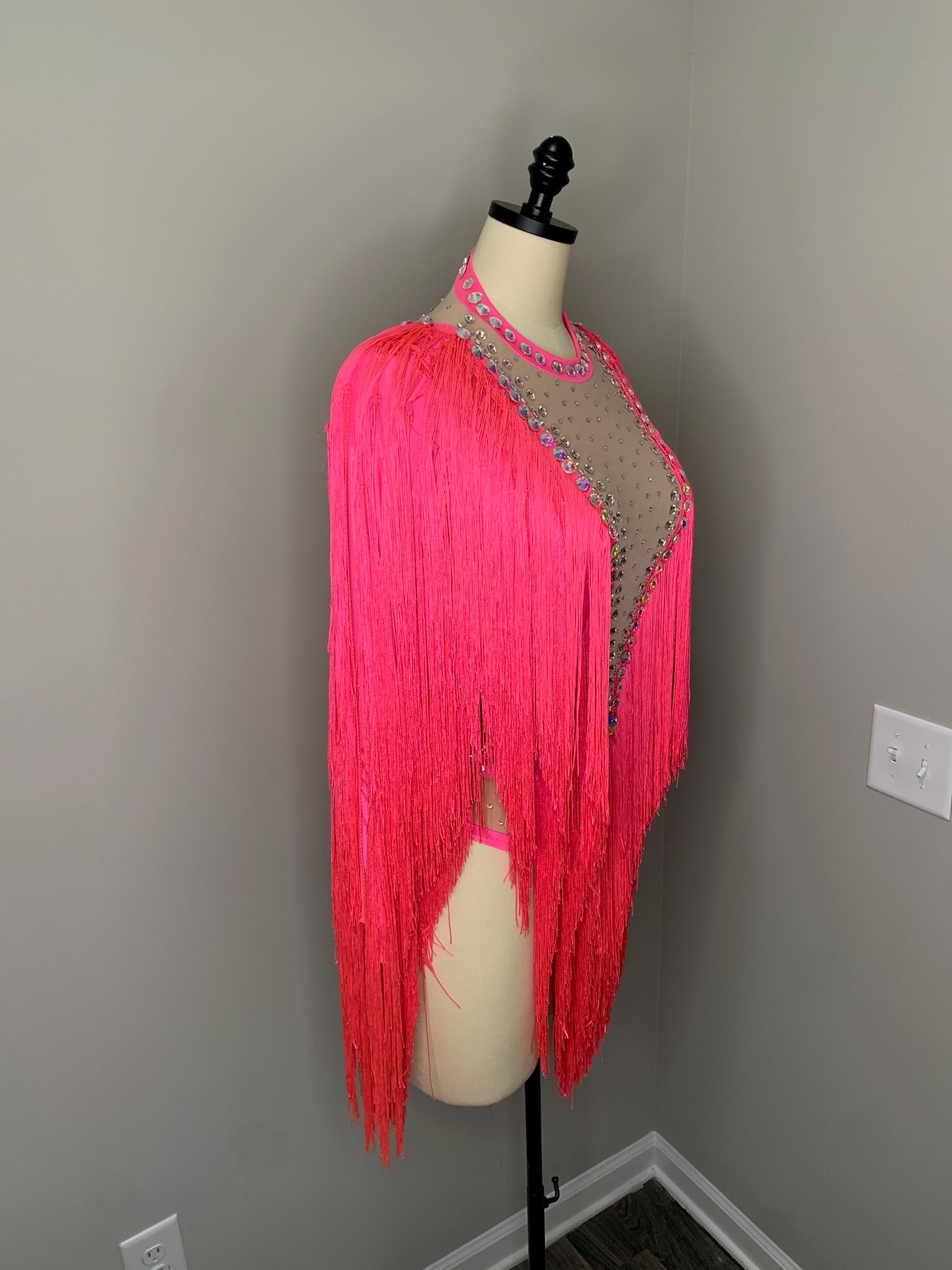 bright pink fringe leotard, pink fringe dance leotard, pink leotard with fringe, fringe leotard for girls, pink performance leotard, hot pink drag costume, Carwash fringe,