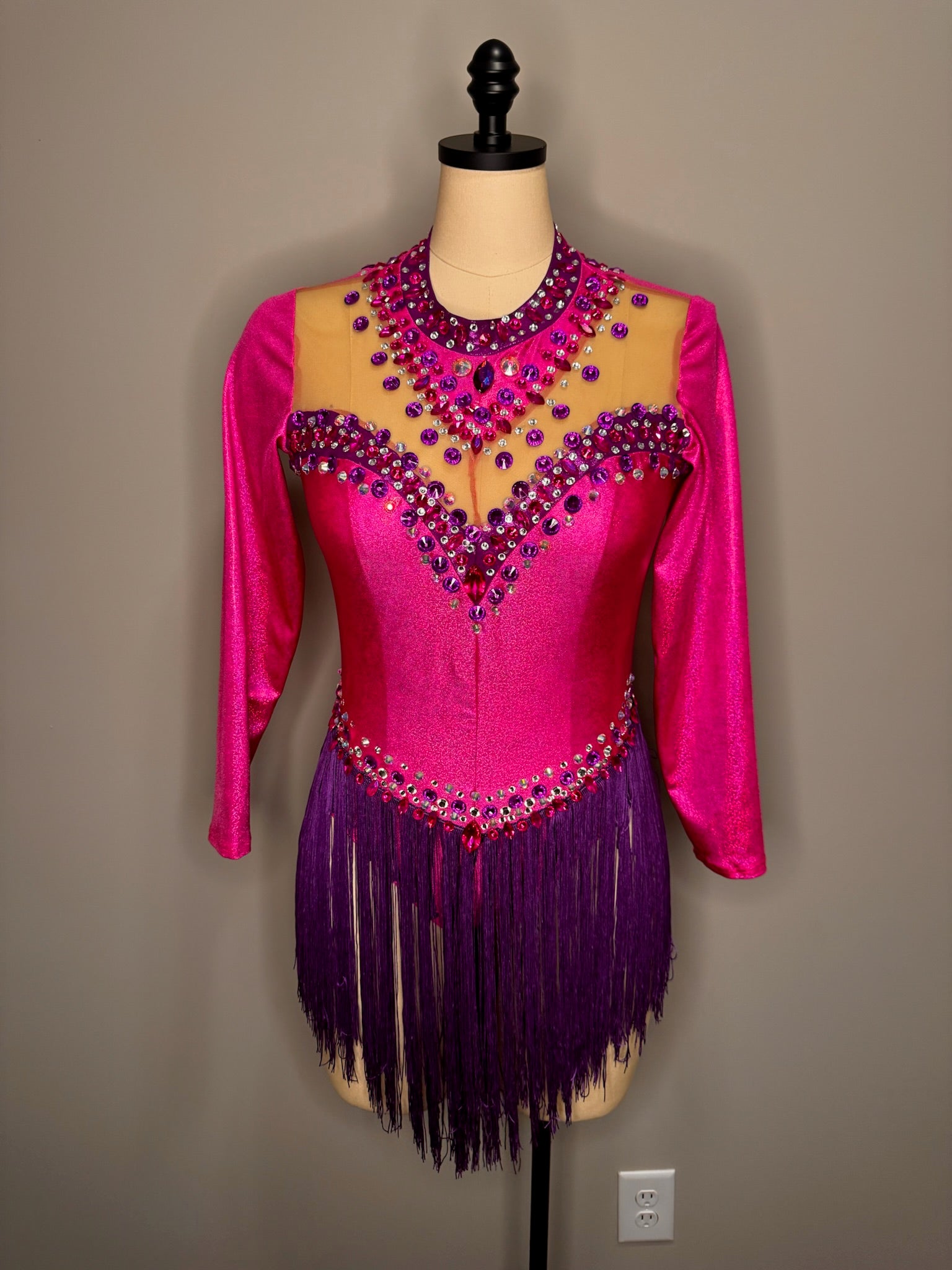 pink and purple fringe leotard, long sleeve fringe leotard, pink and purple drag leotard, fringe leotard with sleeves, long sleeve performance leotard, two-tone fringe drag costume