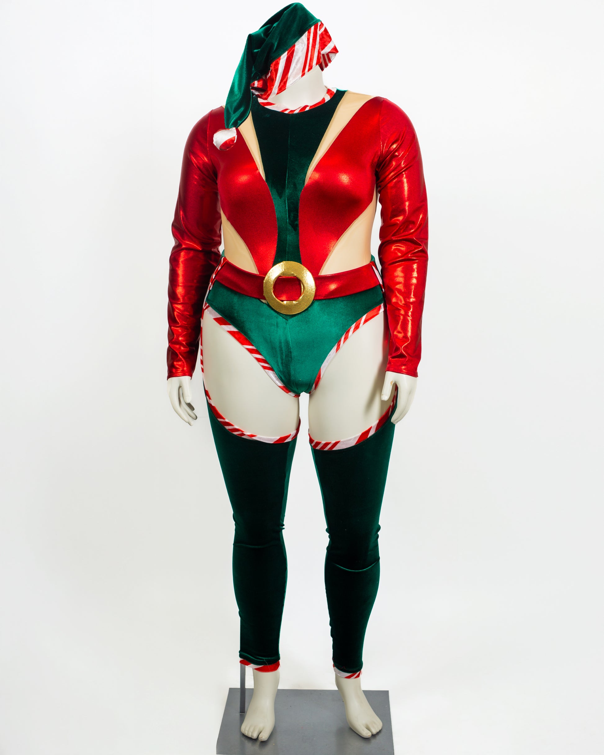 Strategic mesh illusion cutouts shape the body and create a dramatic hourglass effect, while peppermint-striped trim pops against the deep jewel tones. The high-cut bodysuit is paired with attached velvet chaps for a sleek, elongated silhouette. A gold statement belt buckle and matching elf hat complete the look—ideal for drag performers, dancers, hosts, and holiday entertainers who want maximum stage presence with minimal effort.
